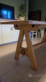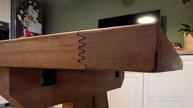 Si tratta di un mobile di alta fattura artigianale, caratterizzato da una struttura solida e "eterna". Il design è di tipo rustico/fratino, con gambe a cavalletto e traversa centrale bloccata da cunei in legno. Particolarmente belli gli incastri a vista sugli angoli del piano, che ne denotano la qualità costruttiva.