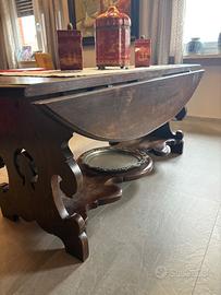 Vendesi tavolo in noce massello , forma ovale molto particolare con le parti laterali pieghevoli il che consente di utilizzarlo come console a muro . Dimensioni aperto 220x130 adeguato per 8-10 persone . con le parti laterali chiuse la larghezza è di 74 cm . Nella parte inferiore è presente un foro per poter alloggiare un braciere in ottone disponibile non presente nella foto. prezzo richiesto € 800,00