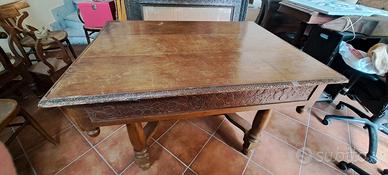 Antico tavolo in noce con fianchi scolpiti. Robusto ed in ordine, ha solo una piccola manutenzione su una cornicetta che è da incollare. Ritiro a Verbania.
