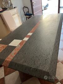 Tavolo in pietra lavica con inserti in marmo botticino e rosso verona