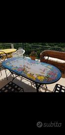 Tavolo in pietra lavica dell'etna dipinto a mano possibilità di avere base e sedie in ferro battuto. Spedisco ovunque con garanzia. Posso realizzare qualsiasi forma dimensione e decoro contattatemi per qualsiasi cosa. Unici in Sicilia che realizziamo il prodotto seguendo tutte le fasi di lavorazione prezzo comprensivo di regolare fattura di acquisto.