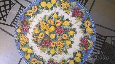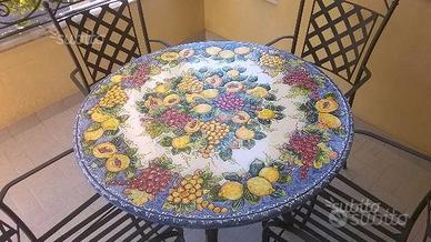 avoli in pietra lavica dell' Etna maiolicati a mano a Vietri sul mare, con basi e sedie tutte in ferro battuto, zincate e verniciate.