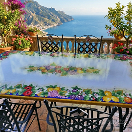 Tavolo misura cm 200x100 cm. rettangolare con angoli sagomati, realizzato interamente a mano da artigiani napoletani specializzati nella lavorazione e nella decorazione della pietra lavica. La pietra lavica garantisce resistenza assoluta a calore, intemperie e usura, mentre il decoro dipinto a mano rende questo pezzo unico e irripetibile. Articolo esclusivo con le decorazioni che potete ammirare in foto. Prezzo comprensivo di base in ferro battuto zincata e 6 sedie in ferro battuto con inserto sullo schienale. Spedizione al domicilio compresa nel prezzo.
