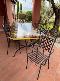 Tavolo misura cm 200x100 cm. rettangolare con angoli sagomati, realizzato interamente a mano da artigiani napoletani specializzati nella lavorazione e nella decorazione della pietra lavica. La pietra lavica garantisce resistenza assoluta a calore, intemperie e usura, mentre il decoro dipinto a mano rende questo pezzo unico e irripetibile. Articolo esclusivo con le decorazioni che potete ammirare in foto. Prezzo comprensivo di base in ferro battuto zincata e 6 sedie in ferro battuto con inserto sullo schienale. Spedizione al domicilio compresa nel prezzo.