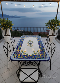 Magnifico tavolo rettangolare con angoli sagomati in vera pietra lavica dell'Etna misura 200x100cm, interamente decorato a mano da maestri ceramisti della tradizione napoletana. Ideale per dare un tocco di eleganza mediterranea a giardini, terrazzi o zone living interne.