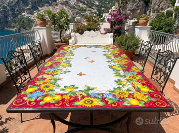 Splendido tavolo rettangolare in vera pietra lavica dell'Etna misura 200x100 cm, interamente decorato a mano da maestri ceramisti della tradizione napoletana. Ideale per dare un tocco di eleganza mediterranea a giardini, terrazzi o zone living interne.
