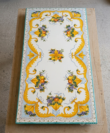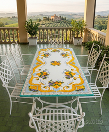 Splendido tavolo rettangolare in vera pietra lavica dell'Etna misura 200x100 cm, interamente decorato a mano da maestri ceramisti della tradizione napoletana. Ideale per dare un tocco di eleganza mediterranea a giardini, terrazzi o zone living interne.