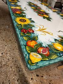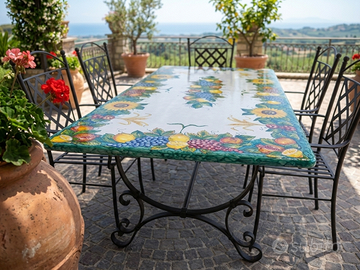 Splendido tavolo rettangolare in vera pietra lavica dell'Etna misura 200x100 cm, interamente decorato a mano da maestri ceramisti della tradizione napoletana. Ideale per dare un tocco di eleganza mediterranea a giardini, terrazzi o zone living interne.
