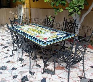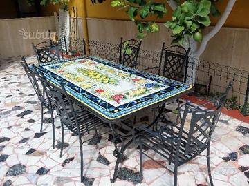 Tavolo in pietra lavica dell' Etna maiolicati a mano a Vietri sul mare, con basi e sedie tutte in ferro battuto, zincate e verniciate.
