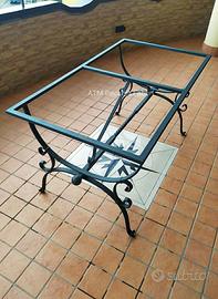 Tavolo in pietra lavica vietrese maiolicato a mano a Vietri sul Mare, con base in ferro battuto zincata a caldo e verniciata a fuoco.