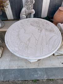 Il piano, finemente inciso con un motivo decorativo artistico, poggia su una base centrale a colonna scanalata che conferisce solidità e un carattere classico al design complessivo.