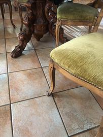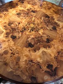 Vendo tavolo rotondo in radica di noce,diametro 130cm altezza 80cm. Il tavolo non e’ allungabile, insieme regalo sei sedie imbottite. Il tavolo da come si puo’ vedere in foto ha una gamba centrale intarsiata. Il trasporto e’ a carico dell’acquirente, il ritiro presso mio domicilio.