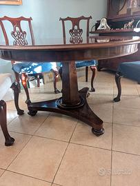 Bellissimo tavolo rotondo allungabile in legno massello di Radica di noce, misure 120 cm di diametro chiuso e allungabile con 2 pezzi da 46 cm ognuno per un totale di 212 cm di lunghezza. A corredo 4 sedie sempre in radica di noce con qualche graffio