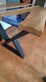 Vendo tavolo in legno massello di noce e resina epossidica colore blu lucida, fatto a mano con bordo smussato. Misure: L 150 P 69 H 75 SP 3,5.