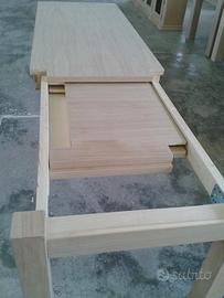 (apertura a scorrimento tramite corsie molto resistenti in legno, con 2 allunghe contenute in uno scompartimento sotto al tavolo,a scomparsa);