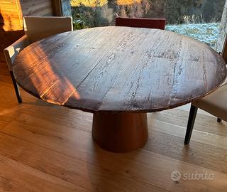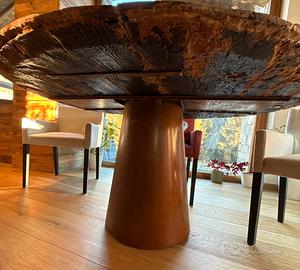 Tavolo rotondo in rovere diametro 150cm. La base é in corten ed é stata fatta dal fabbro su misura. Il piano é il fondo in rovere di una botte di circa 100 anni che é stata restaurata da un artigiano di Aosta