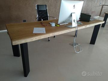Tavolo scrivania costruito in tavola in pezzo unico naturale (direttamente asse da pianta) di rovere massello smussate scortecciato mantenendo il più possibile la pattina originale che è stata resa dal tempo, spazzolato. le misure indicative dato che si è mantenuto lo spessore originale della tavola completo di taglio in lunghezza con aggiunta dei chiodi per tener fermo il legno nel tempo, lungh. 200 prof.110 spessore della tavolo circa 5cm pulito, h completo di gambe in ferro 80 da verificare in caso di accordo dato che ogni tavolo viene personalizzato, le gambe sono costruite con tubolare in ferro da 15 x 5 inclinato verso l'angolo con saldato piastra sottostante da spessore 0,8 cm misura 25x25 in modo da dare resistenza e robustezza al tutto dato che è pesante con gomma sottostante senza rovinare il pavimento. barre incassate di ferro a T per dare robustezza al tutto in modo che non si muova nel tempo. Essendo artigiani costruiamo mobili e quant'altro su specifiche ed esigenze del cliente, completo di finitura trasparente impermeabile sul legno e riempimento in caso di stucco nero dove ci sono crepe o spaccature importanti; nero opaco sulle gambe. franco fabbrica iva da calcolare a parte. il tavolo è già stato prodotto e venduto su commissione non teniamo magazzino ma essendo i diretti produttori possiamo costruirlo come uno lo desidera in base alle proprie esigenze. trattate direttamente con il produttore per dubbi e chiarimenti contattateci. ASTENERSI RIVENDITORI E COMMERCIANTI