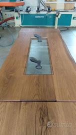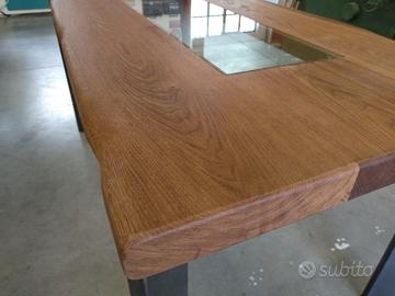 Tavolo costruito in rovere vecchio recuperato da trave mantenendo effetto scortecciato laterale, con misura lunghezza 170 prof.90 h 80 composto con 4 gambe in ferro con tubolare da 10 x 4 con piastra sottostante e gomma applicata in modo da non rovinare il pavimento, sopra tra gamba e gamba traverso in ferro per stabilità e sicurezza del tutto avvitato parte sottostante con viti, lo spessore del piano è di circa 5,5 cm circa, parte interna scavata per alloggiare all'interno uno spazio per decori con vetro con misura 110 x 30. Compreso 2 allunghe esterne al tavolo da riporre in un angolo della casa con baionette da inserire successivamente con misura 50 cm cadauna tutto spazzolato e levigato in modo che sia morbido al tatto, finitura effetto grezzo per il piano con questo prodotto nessun liquido penetra all'interno e gambe verniciate finitura nero opaco. Essendo un laboratorio artigianale costruiamo mobili e quant'altro su specifiche ed esigenze del cliente, iva da calcolare a parte franco fabbrica. il tavolo è già stato prodotto e venduto su commissione non teniamo magazzino ma essendo i diretti produttori possiamo costruirlo come uno lo desidera in base alle proprie esigenze. trattate direttamente con il produttore per dubbi e chiarimenti contattateci. ASTENERSI RIVENDITORI E COMMERCIANTI