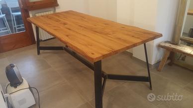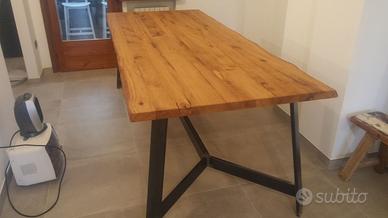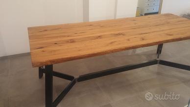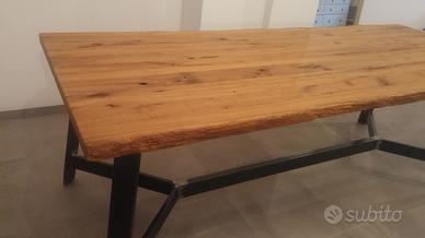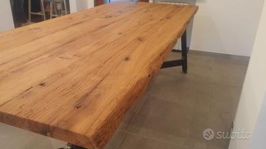 Tavolo costruito in legno di rovere VECCHIO RECUPERATO e segato da travi vecchie di abitazioni o casolari con le varie spaccatura (non troppo accentuata e vari nodi), con misure lunghezza 240 altezza 80 profondità 100 cm. Le gambe saranno costruite in ferro con tubolare da 8 x 2 tutto fisso (previo passaggio scale o altro) ma con possibilità di farlo per metà smontabile e unito con varie viti sul traverso centrale, in modo che sia tutto un corpo unico, con gamba inclinata completa di traverso sotto con telaio apposito per fissare il piano spess.4 cm dalla struttura al piano. Dai lati il piano avrà bordo irregolare leggermente smussato (al naturale come il tronco e natura comanda) tutto verrà spazzolato e levigato in modo che sia morbido al tatto, sotto al piano verranno fatti dei tagli e inseriti ferri a T incassati in modo da dare robustezza e soprattutto che il legno non si muova nel tempo. Unione con cola vinilica (certificata) e anime interne tra tavola e l'altra. Il piano verrà lucidato con effetto grezzo naturale trasparente (che non altera il colore) impermeabilizzato in modo che non penetri liquidi all'interno del legno e sul ferro una finitura trasparente (o da scegliere con sovraprezzo) e come scelto dal cliente che si vedano le smerigliature tra unione del telaio. prezzo franco fabbrica come descritto iva non comprendente, è già stato prodotto su commissione e non teniamo magazzino ma essendo i diretti produttori si possono riprodurre fedelmente o modificando in base alle proprie esigenze per dubbi e chiarimenti contattateci per un preventivo, essendo i diretti produttori costruiamo su misura e fattezza da disegno o foto del cliente come si desidera. ASTENERSI RIVENDITORI E COMMERCIANTI