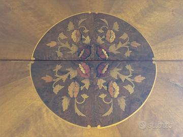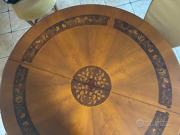 Tavolo artigianale in legno, in stile, intarsiato e allungabile con allunghi incorporati. Diametro 120 cm. Il piano è in condizioni perfette. 6 sedie imbottite, in stile, buone condizioni. Vendo anche separatamente Visionabile prima del ritiro. Ritiro a cura dell’acquirente