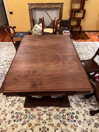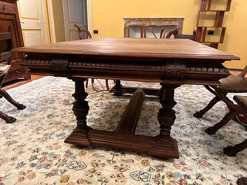 Splendido tavolo in noce scuro, realizzato nei primi del Novecento, che incarna il fascino opulento del Barocco toscano.