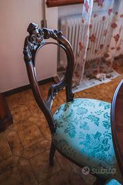 Vendo tavolo pregiato con intarsi in stile classico in legno Radica con 6 sedie della medesima produzione. Il tavolo è allungabile. No perditempo.