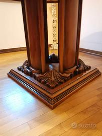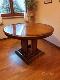 Tavolo color noce chiaro, rotondo ma allungabile a forma ovale. Sedie ricoperte in velluto verde come da foto. Ritiro a carico dell'acquirente a Comerio (VA)