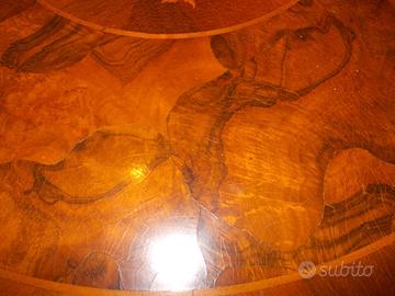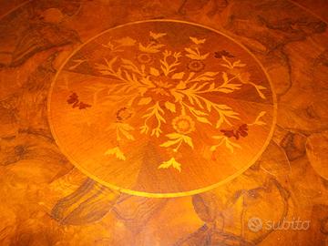 Tavolo rotondo in legno massiccio noce nazionale stile Cerea con inserti in radica.