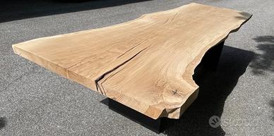 vendo un belissimo Tavolo in legno rovere a pezzo unico fatto a mano incluso la struttura in acciaio. Dimensioni 285x 90-120 cm altezza 75cm.