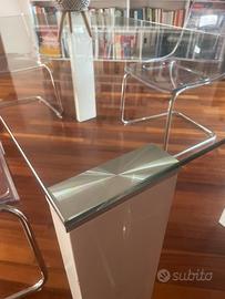 Vendo tavolo da pranzo moderno con piano in vetro temperato e struttura bianca, completo di 4 sedie in policarbonato trasparente con base in metallo cromato.