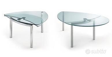 Policleto by reflex. Tavolo in vetro temperato da 15mm. Allungabile. Piano sagomato. Base a tre zampe a sezione tonda in acciaio inox satinato.