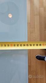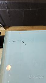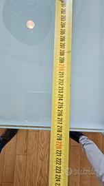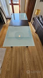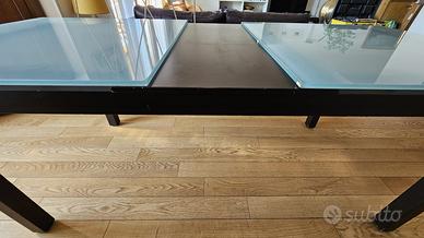 Tavolo Cargo Hi Tech Milano, allungabile con piano in vetro. Struttura in legno finitura wengè. Qualche segno di usura come in fotografia. Misure 85x170 chiuso (6 posti) e 85x218aperto (8 posti).