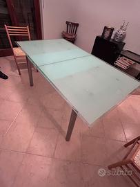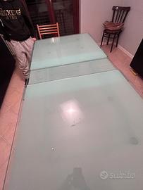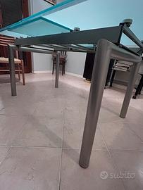 Tavolo in vetro Calligaris con 4 sedie in pelle nera. Tavolo rettangolare allungabile.