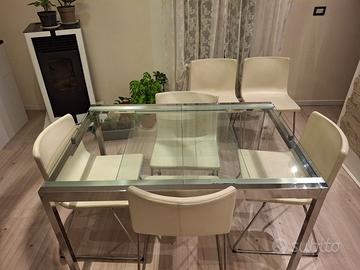 Vendo tavolo in vetro temperato trasparente allungabile con struttura in metallo cromato, completo di 6 sedie IKEA in pelle beige (valore originale circa 120€ ciascuna).