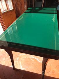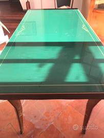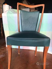 Tavolo in vetro verde con sei sedie in pelle coordinate. Bellissime anni 60