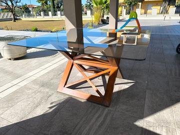 Tavolo in cristallo con base in legno quadrato 150x150 cm. 8 posti comodi in perfette condizioni, utilizzabile anche all'esterno.