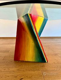 Tavolo con base in legno e piano in vetro di diametro 130 cm, altezza 75 cm.