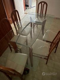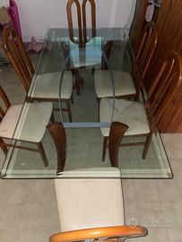 Tavolo con piano in vetro e gambe di legno e 6 sedie con cuscino simil pelle e piedi in legno.