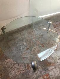 Vendo elegante tavolo da salotto con piano in vetro temperato trasparente e tre gambe in metallo satinato dal design moderno e raffinato.