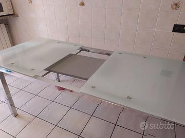 Vendesi tavolo da cucina della IMS con struttura in acciaio e piano in vetro. Il tavolo misura in altezza da terra 80 cm, è lungo (da chiuso) 160 cm ed è largo 90 cm.