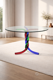 Tavolo in vetro di Murano dal design scultoreo, elegante e di forte impatto visivo. Piano rotondo in vetro trasparente con bordo molato e base intrecciata in vetro colorato, che crea giochi di luce e trasparenze. Design riconducibile a tavoli in vetro di Murano anni ’70, presenti in collezioni e gallerie internazionali. Ideale per ambienti moderni e per chi apprezza il design italiano e l’artigianato artistico. Dimensioni: Altezza 75 cm – Diametro 127,5 cm Condizioni: ottime, nessuna crepa o rottura. Il tavolo è di mia proprietà, descritto e fotografato in modo fedele. Disponibile a fornire ulteriori foto o informazioni su richiesta. Ritiro a mano preferito vista la delicatezza dell’oggetto. Scrivimi senza problemi per info o altre foto