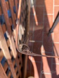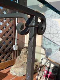 tavolo con struttura in ferro battuto. piano.in vetro vendo per inutilizzo. il vetro presenta delle parti danneggiate sui bordi.