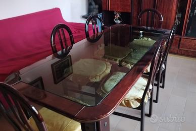 Struttura tavolo in legno, piano in vetro, 6 sedie. Disponibile su ritiro.