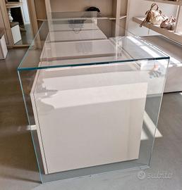 Tavolo (banco) in vetro con basi in legno, visibile a Cattolica. Altezza da terra vetro 91 cm Profondità 80cm Larghezza 218cm Misure 4 mobiletti sotto il tavolo: Altezza Mobiletti sotto 71cm Larghezza 45cm Profondità 72cm No perditempo.