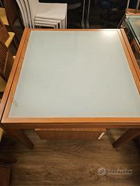 Tavolo da pranzo elegante con struttura in legno e piano in vetro smerigliato opaco, dal design moderno e raffinato. Dotato di pratica funzione allungabile, ideale per adattarsi alle esigenze quotidiane e perfetto per ospitare più invitati in occasione di pranzi o cene.