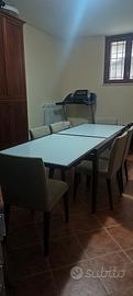 tavolo con pianale in vetro e telaio in legno color noce scuro pianale allungabile comprese 6 sedie in stoffa