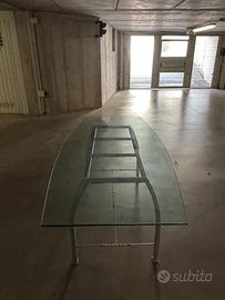 Tavolo in vetro temperato e acciaio, in vendita per trasloco Dimensioni: Vetro: lunghezza 200 cm, larghezza da 70 cm a 90 cm, spessore 1,3 cm temperato Gambe: lunghezza 120, larghezza sopra 42 cm, sotto 67,5 cm