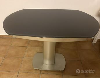 Tavolo di cristallo grigio scuro poggiato su una base robusta e centrale.Il tavolo è comodamente allungabile (è sufficiente roteare il tavolo da chiuso per far aprire le alette laterali).