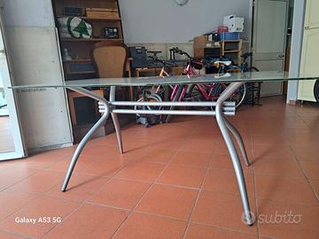 Tavolo in vetro temperato opaco con supporto in metallo. Simile a quello della seconda foto. Anziché trasparente, opaco satinato.