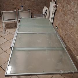 vendo tavolo in vetro temperato con le rispettive misure altezza 74 cm 110x110 cm chiuso mentre aperto 110 x 180 cm regalo anche le 4 sedie della bontempi casa in resina . Il tavolo e le sedie sono made in italy (presenta qualche lieve graffio nella struttura il vetro è perfetto)